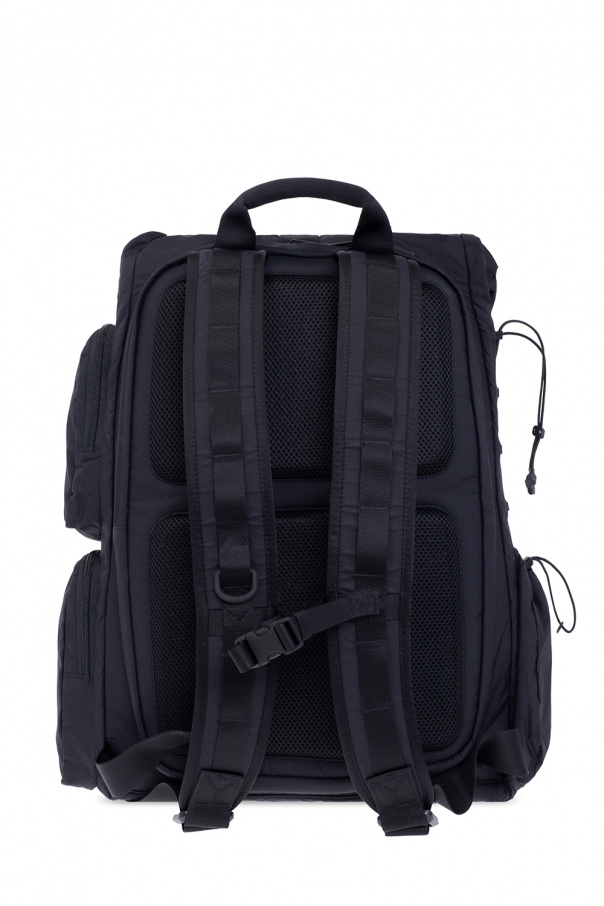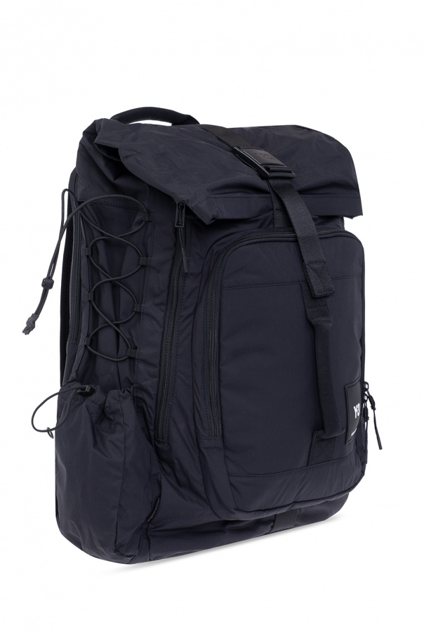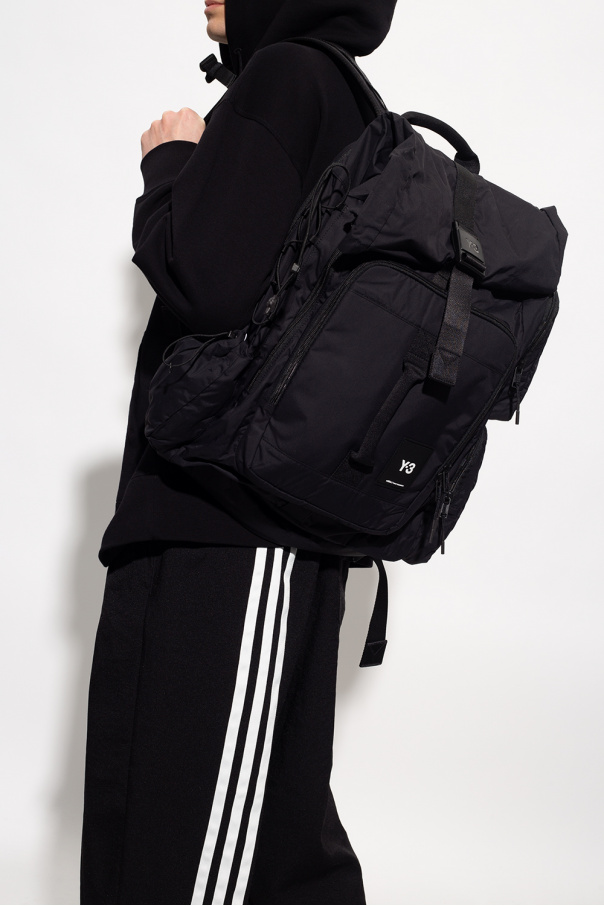 Black backpack from Y-3 Yohji Yamamoto. Crafted from durable CORDURA® nylon, this design secures with a fidlock buckle and features a two-way zip pocket with a silicone logo patch on the front, three side pockets: two zipped ones and one with a drawstring closure, a back zip pocket, a top handle, adjustable shoulder straps and an interior with a side opening and three capacious pockets: a slip one, a zip one and a velcro one.