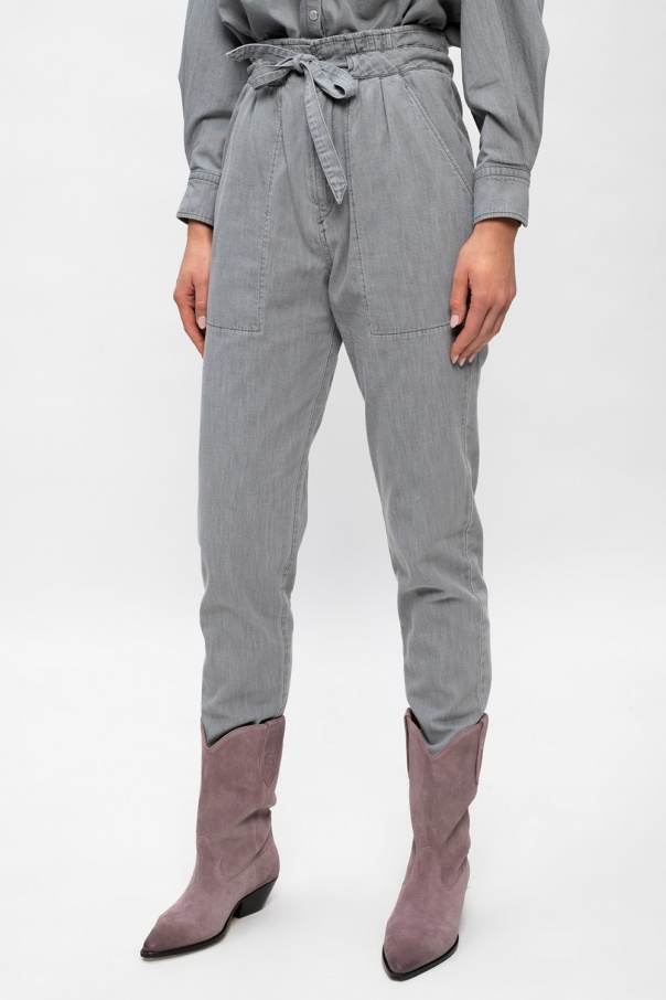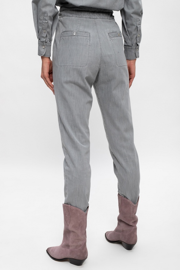 Grey jeans from Isabel Marant Étoile. Crafted from washed-out cotton denim, this pair falls down with tapered legs and employs cinching drawcords at the waist, zip and snap fastenings, tow slant front pockets and two snap-fastened back pockets.