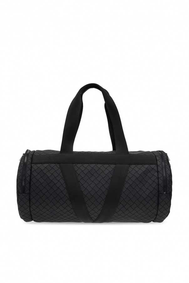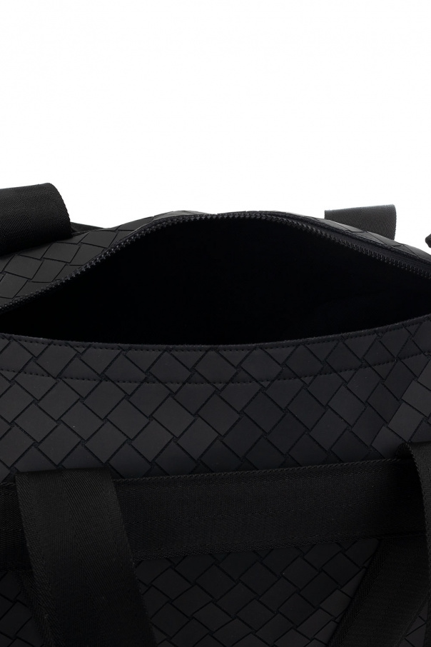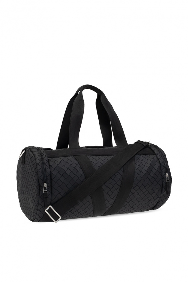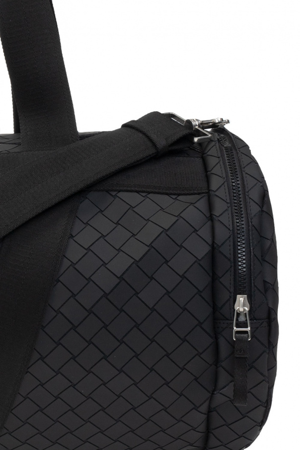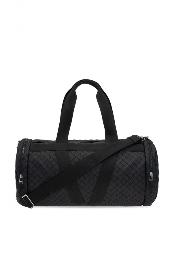 Black duffel bag from Bottega Veneta. Enriched by a laser-cut Intrecciato pattern, this design secures with a zip and features two half-round handles, a detachable and adjustable shoulder strap, two zipped pockets on the sides, silver-tone metal hardware and one internal compartment.