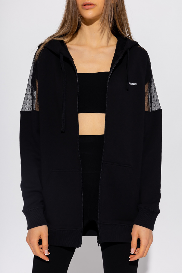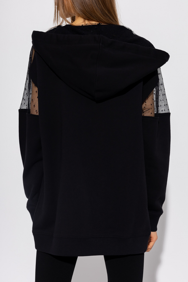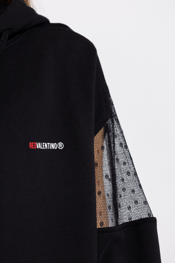 Black oversize hoodie from Red Valentino. Made of cotton, this garment features a zip fastening, drawstring hood, logo print, decorative tulle inserts with the label’s signature ‘Point d’Esprit’ pattern, two slip pockets and ribbed trims at the hem and cuffs.