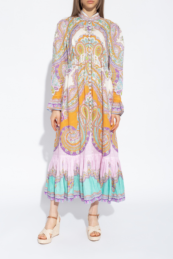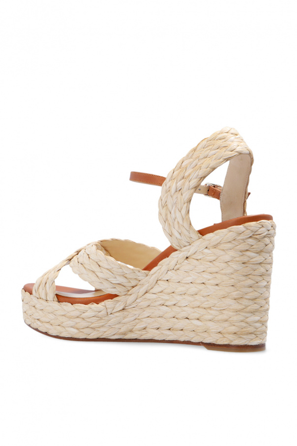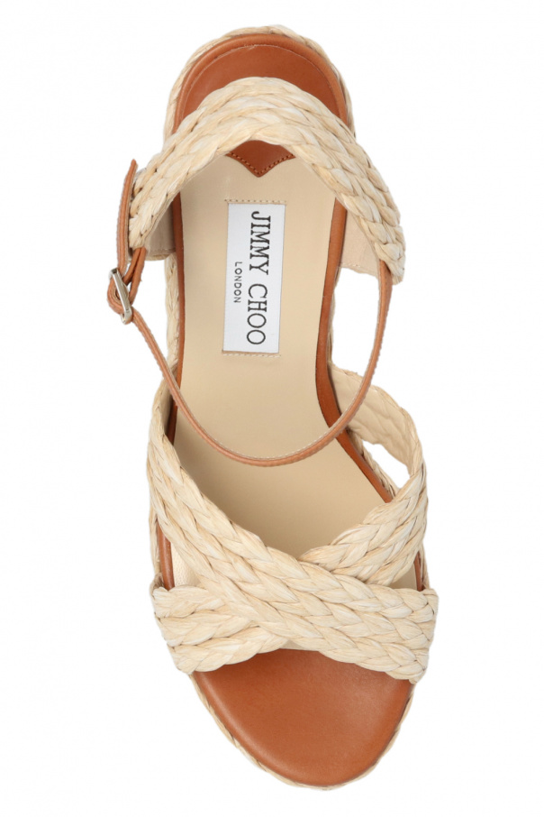 Cream and brown ‘Dellena’ wedge sandals from Jimmy Choo. Made of woven raffia and leather, this model features a buckle ankle strap fastening, a leather monogram appliqué and a beige sole in leather and rubber.