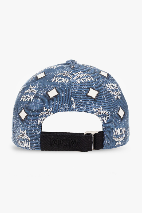 Blue baseball cap from MCM. This design features a white and black monogram pattern and adjustable strap with velcro at the back.
