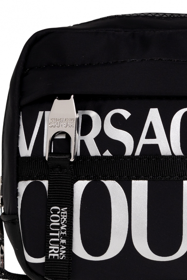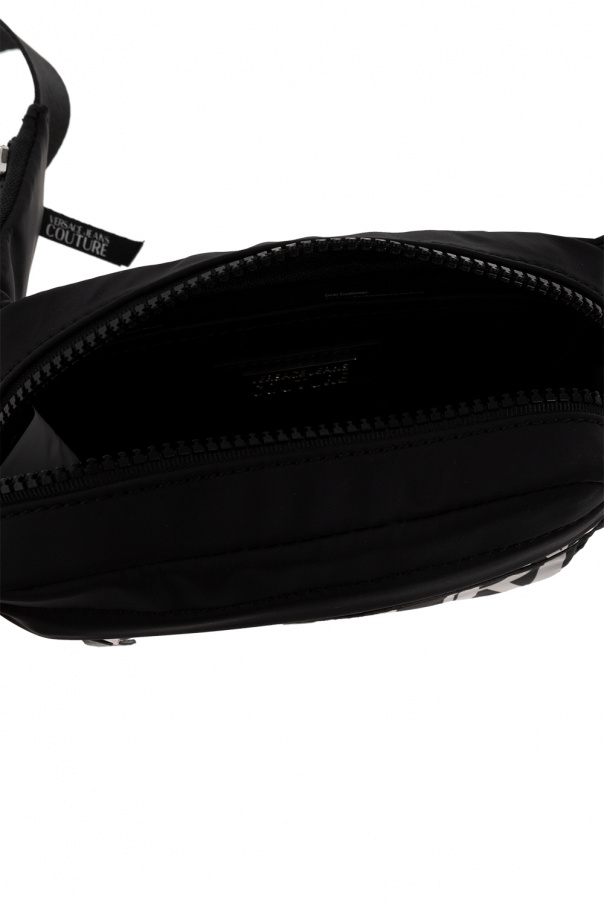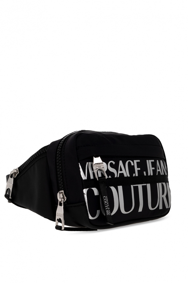 Black belt bag from Versace Jeans Couture. Printed with the brand's logo in silver-tone, this design features a zip fastening, two zip pockets (one on the front and one on the side), an adjustable strap and one internal compartment with a slip pocket.