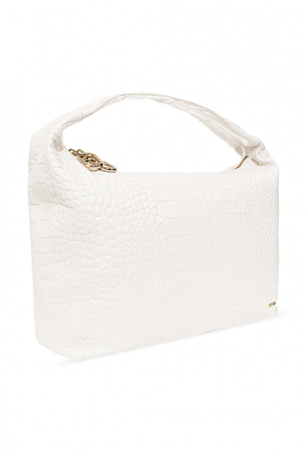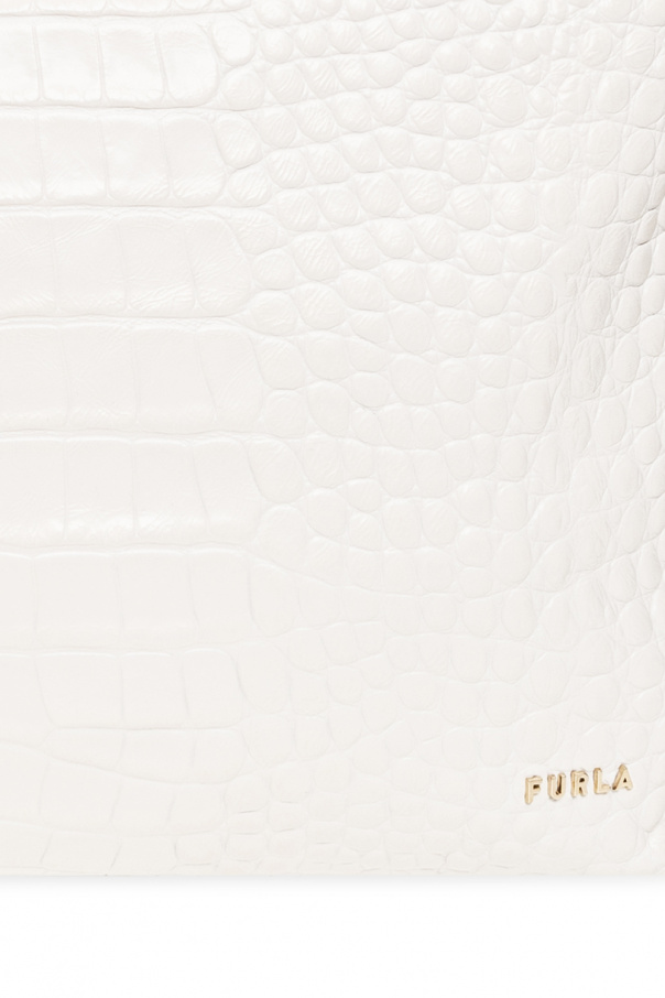 White ‘Ginger Large’ hobo bag from Furla. Made of leather with a crocodile skin effect, this model features a two-way zip, metal logo appliqué in gold-tone, half-round handle, gold-tone metal hardware and one internal compartment with two slip pockets and one zip pocket.