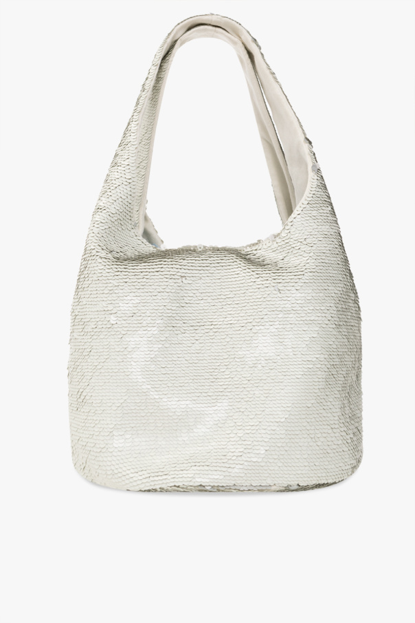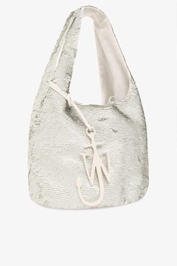 White and silver-tone ‘Sequin Mini’ handbag from J.W. Anderson. Made of fabric embellished with sequins, this model features leather drawstrings, two detachable handles with the brand’s signature anchor charm and one internal compartment.
