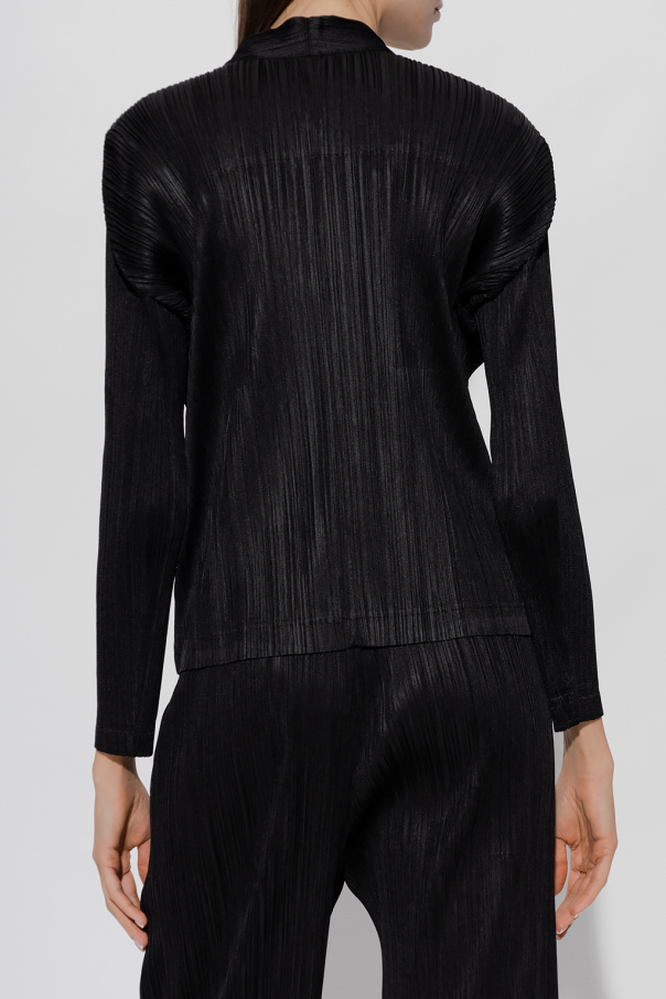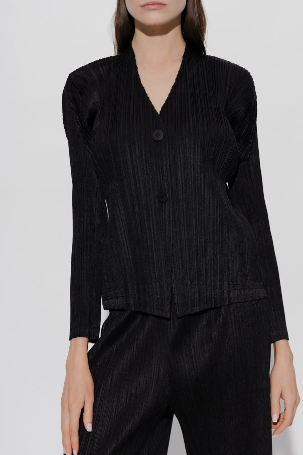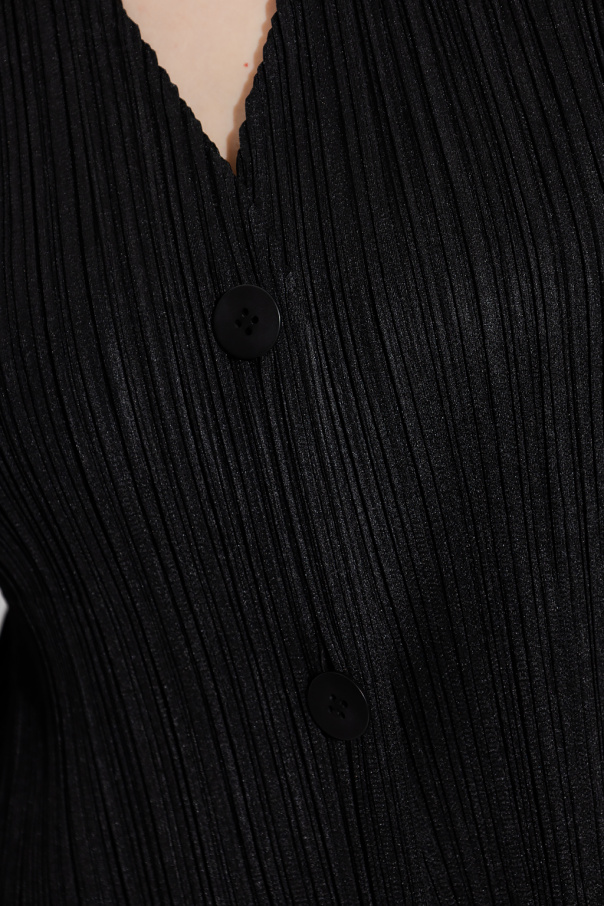 Black pleated cardigan from Issey Miyake Pleats Please. Fastened with buttons, this long sleeve design has two slip pockets.
