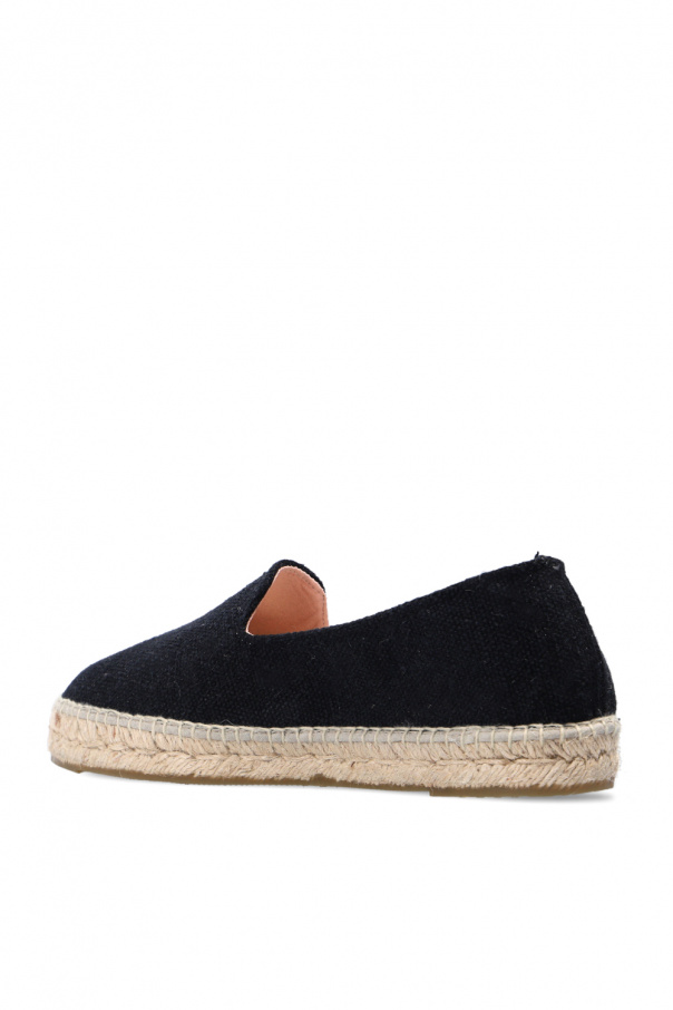 Black 'Hamptons' espadrilles from Manebi. Made of organic linen, this model sits on a natural jute sole with a thin layer of brown caoutchouc.