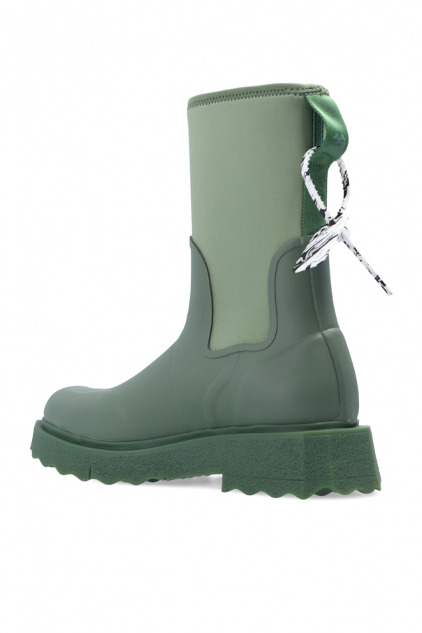 Green rain boots from Off-White. Resting on a green rubber sole, this pair features a sock, ‘For Rainy Days’ text in orange and the iconic zip tie tag in black and white.