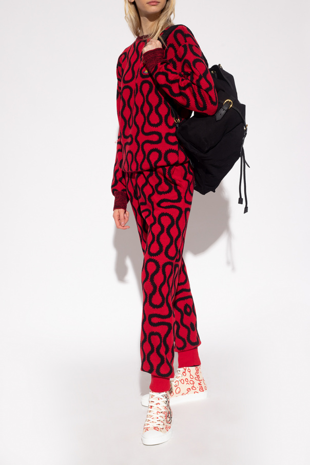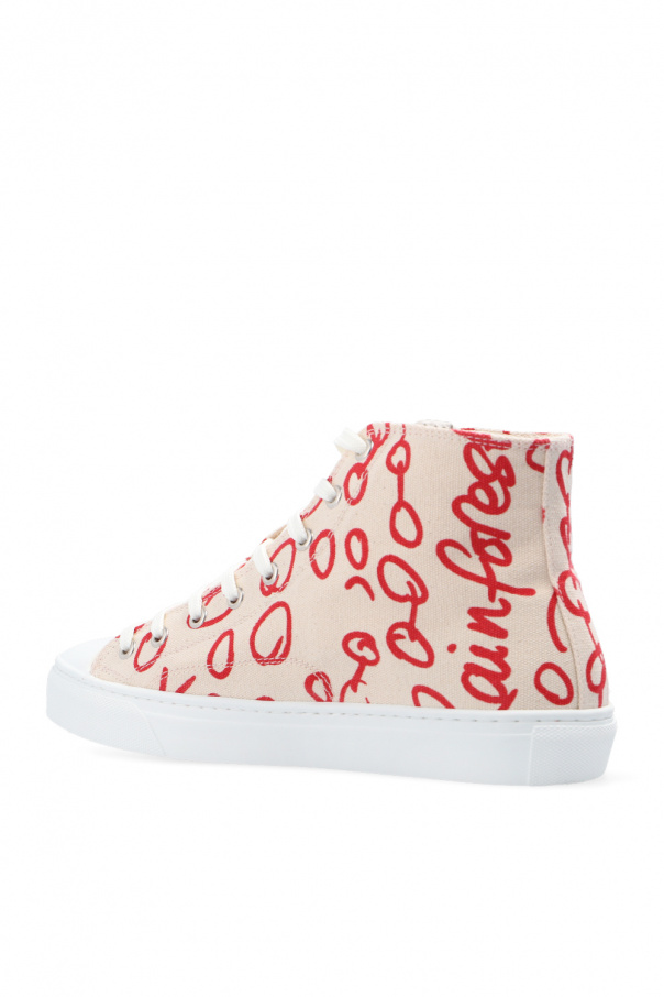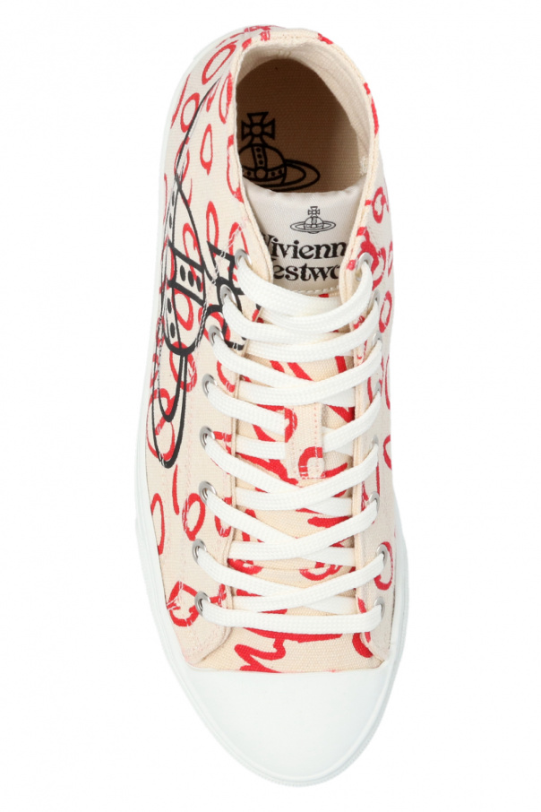 Cream sneakers from Vivienne Westwood. Crafted from cotton with a high-top silhouette, this lace-up model features a red graphic print accompanied by a black logo, rubber trims and a white rubber sole.