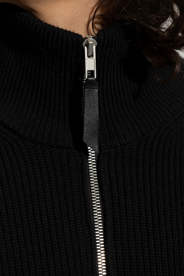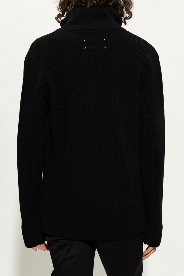 Black ribbed cardigan with a band collar from Maison Margiela. Made of a cotton and wool blend, this garment features a two-way zip, white logo embroidery at the back and ribbed trims at the hem and cuffs.