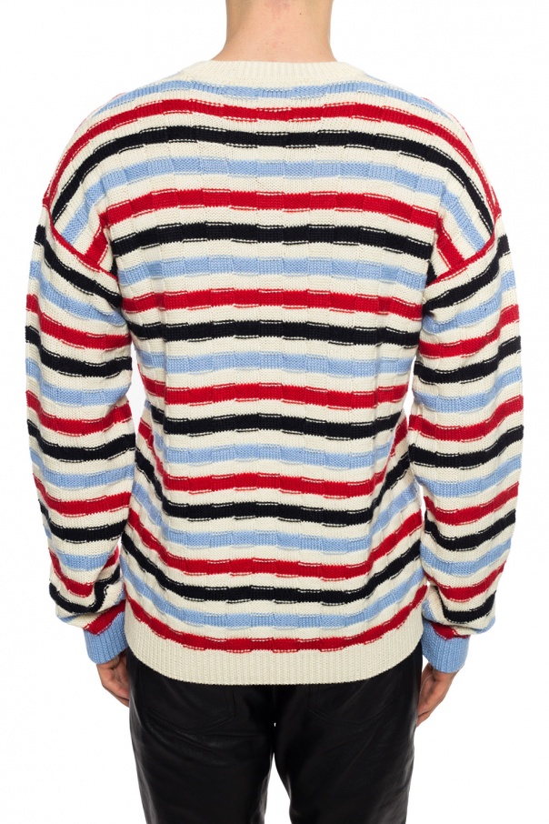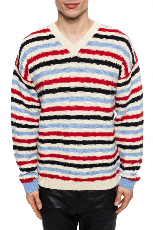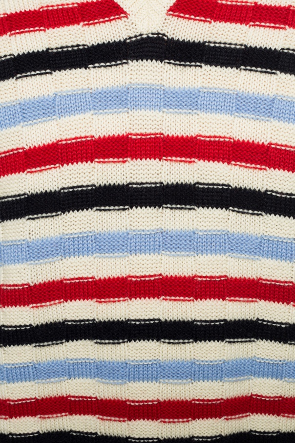 Cream ribbed sweater from Marni. Made of wool. Embellished with knitted red, blue and black stripe pattern. Features V-shaped neckline and long sleeves with elasticated cuffs.