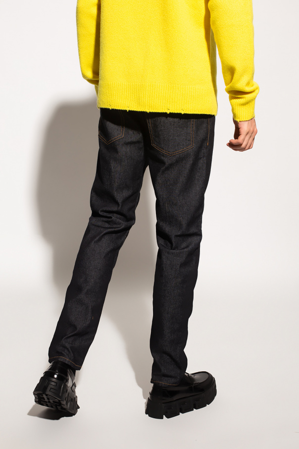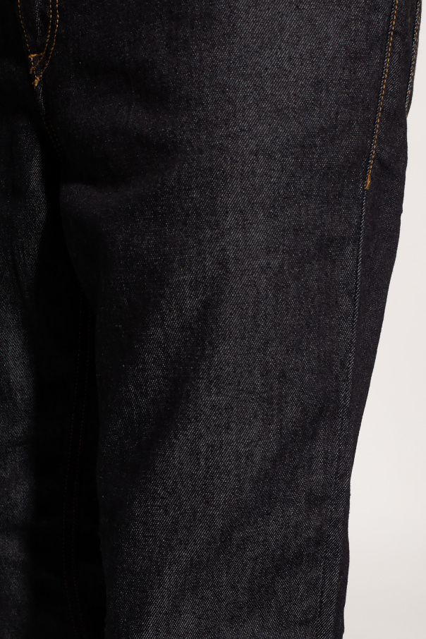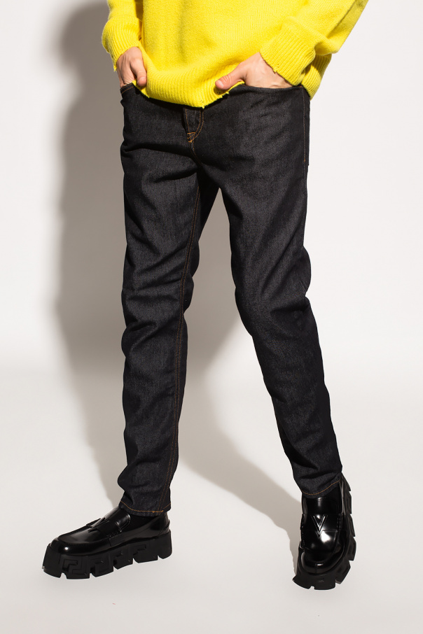 Navy ‘D-Fining’ jeans from Diesel. Fastened with buttons, the pair falls down with slightly tapered legs and is complete with two front and two back pockets.