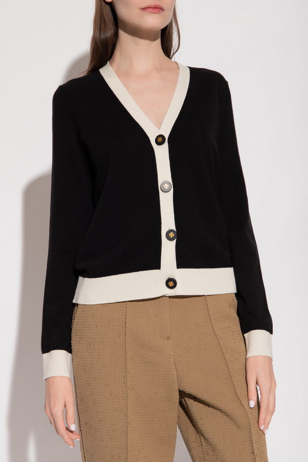 Black and cream cardigan from Tory Burch. Crafted from cashmere, this V-neck design features branded buttons in gold-tone and long sleeves.