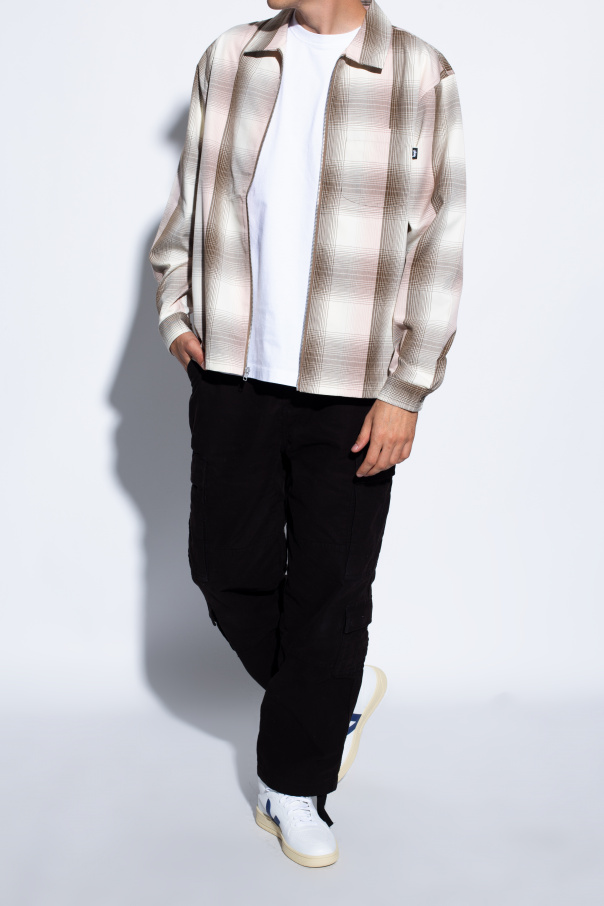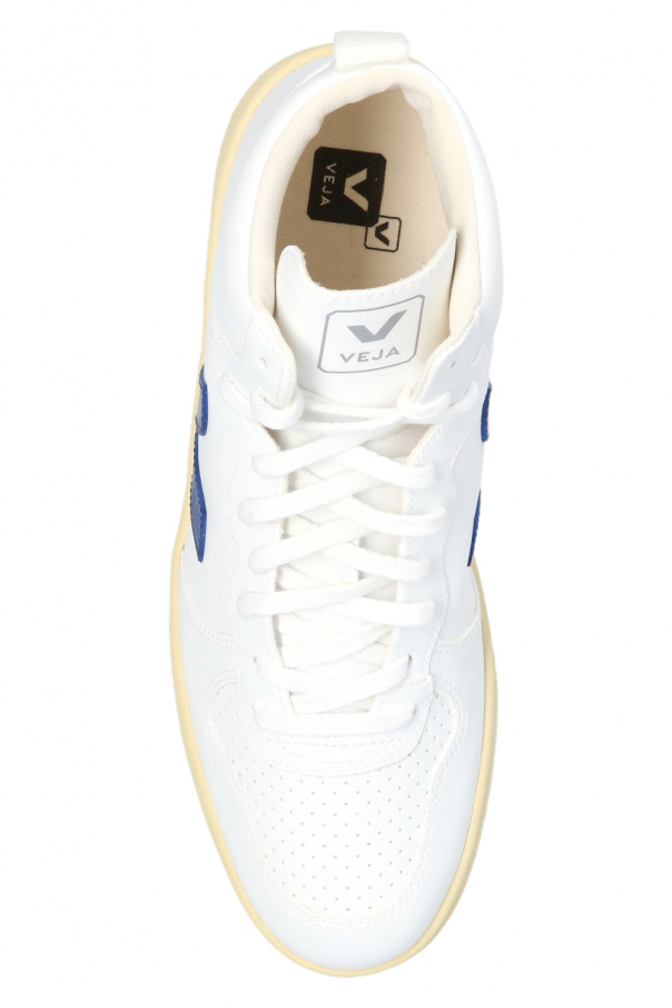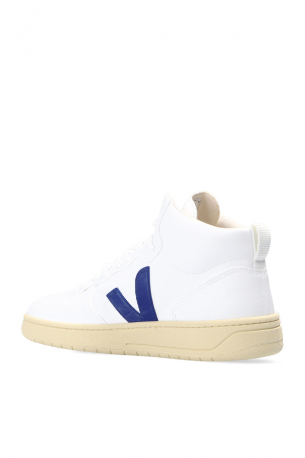 White ‘V-15 C.W.L.’ high-top sneakers from Veja. Crafted from textured organic cotton covered with resin from corn & castor oil – C.W.L. (Cotton Worked as Leather), this lace-up pair is enriched by a logo embossed on the tongue, organic cotton laces, perforations and the label’s signature V logo in navy made of rubber and rice waste. The mesh inner lining made from recycled materials was developed to acquire a better resistance to friction. The organic-sourced and recycled insole is made from sugar cane, Amazon rubber, organic cotton and recycled EVA foam. It is set on a cream rubber sole made of organic and recycled materials.