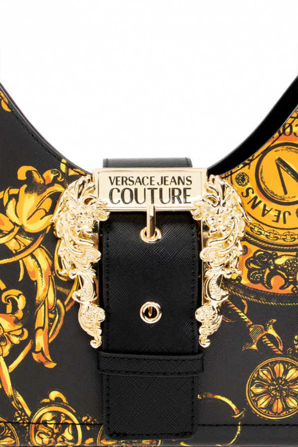 Black hand bag from Versace Jeans Couture. Fastened with a magnetic snap, this model features the label’s signature Baroque print in yellow, orange and brown, a decorative logo buckle, half-round strap, gold-tone metal hardware and one internal compartment with one zip pocket and one slip pocket.