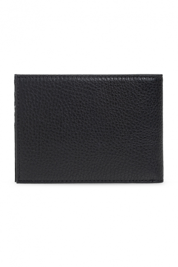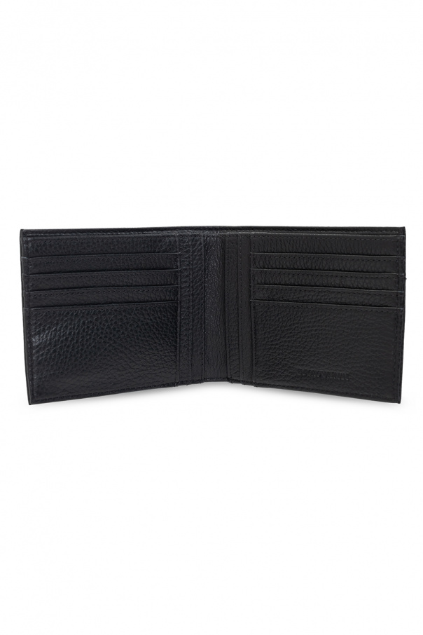 Black leather wallet & keyring set from Emporio Armani. Wallet features a rubber logo detail, two bill compartments, eight card slots and six slip pockets inside. Keyring has an embossed logo.