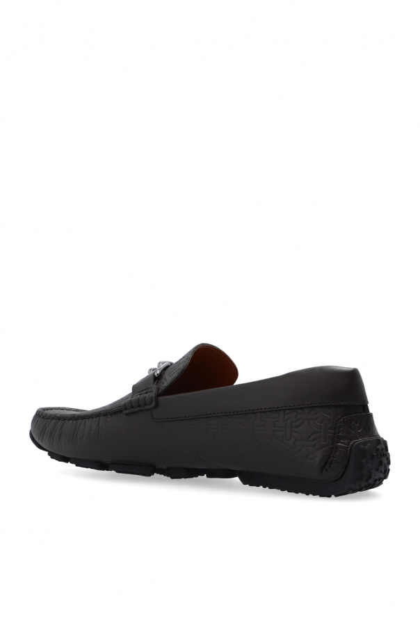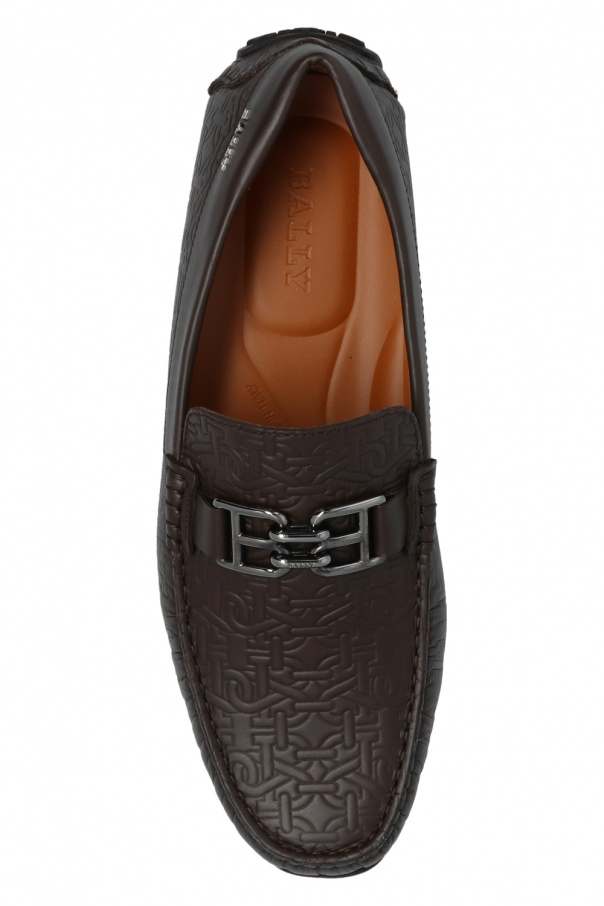 Brown ‘Parsal’ moccasins from Bally. Crafted from calf leather, this pair features a B monogram pattern, metal applique in dark silver-tone and black rubber sole.