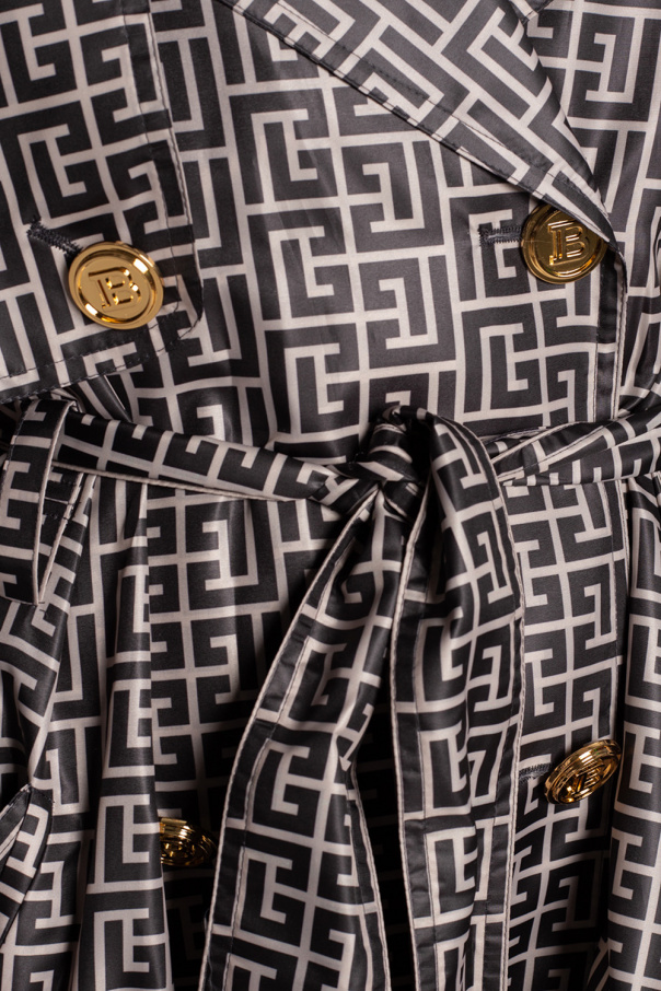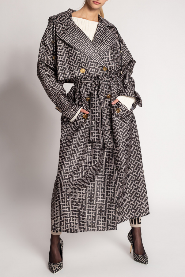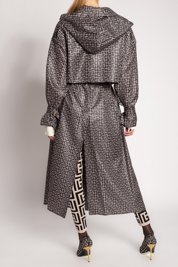 Cream and black trench coat from Balmain. Cut with a double-breasted silhouette, this style showcases a monogram pattern. It is complete with distinctive gold-tone buttons with a logo, a detachable drawstring hood, notch lapels, a waist-cinching belt, two flapped pockets with buttons, a single back vent and long sleeves with buckle cuff straps.