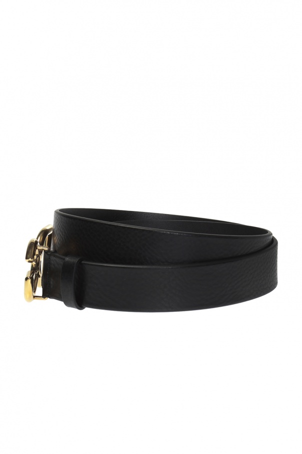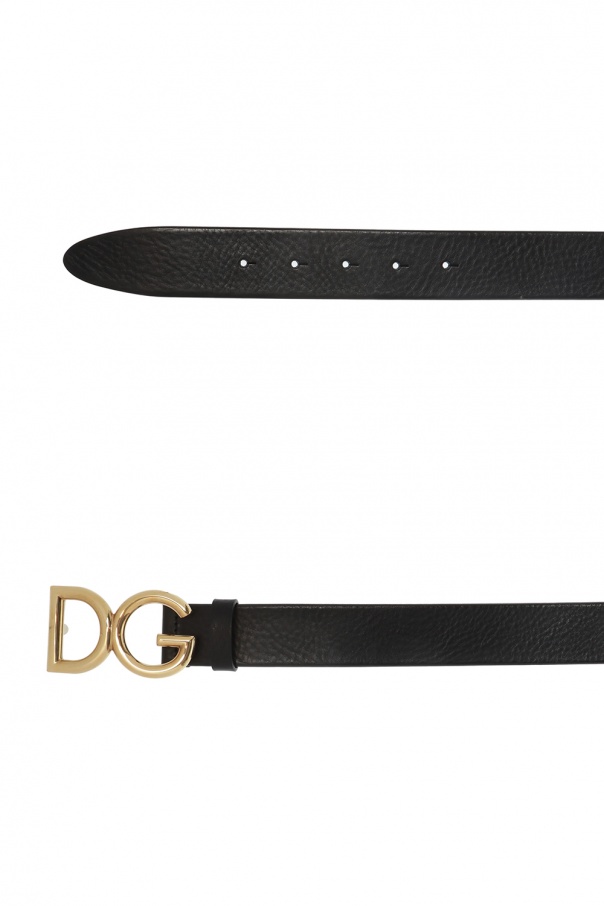 Black belt from Dolce & Gabbana. Made of calf leather with a texture throughout. Features decorative logo-shaped buckle, gold-tone metal fittings and adjustable length.