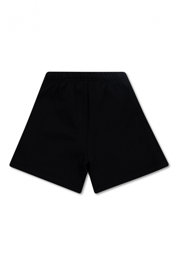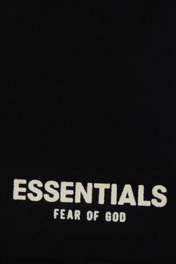 Black shorts from Fear Of God Essentials Kids. Made of cotton, this pair showcases a white pattern with the brand's logo, a drawstring waistband and two slip pockets.