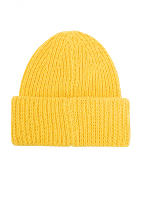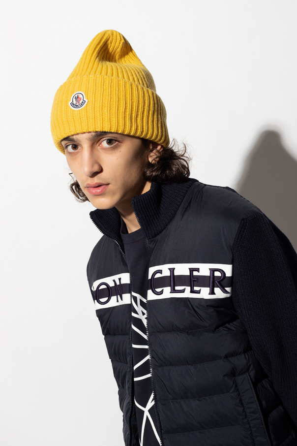 Yellow hat from Moncler. Knitted from a wool and cashmere blend yarn, this design is decorated with a logo patch in white, navy and red.