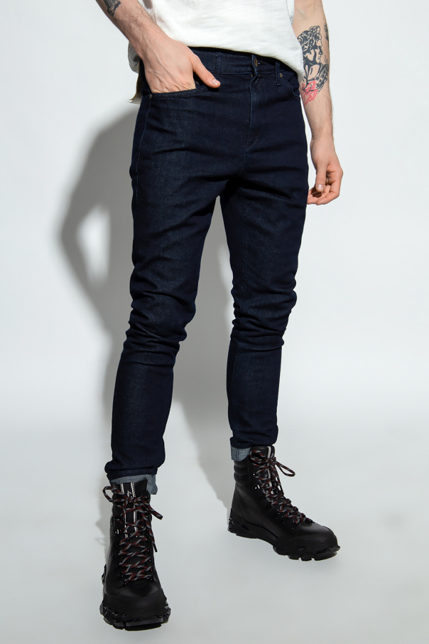 Dark navy blue skinny jeans from Rag & Bone. Made of cotton with Aero Stretch, this pair falls with tapered legs and features a zip fly with a button, classic five pocket and an embroidered white logo on the back.