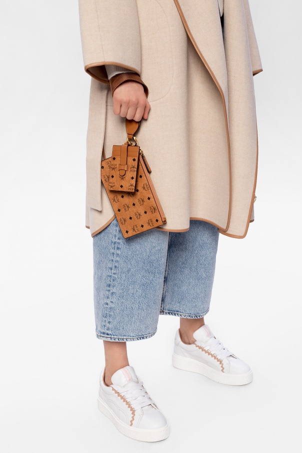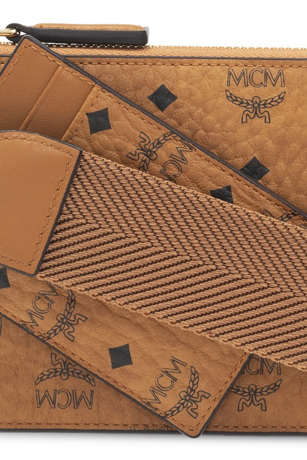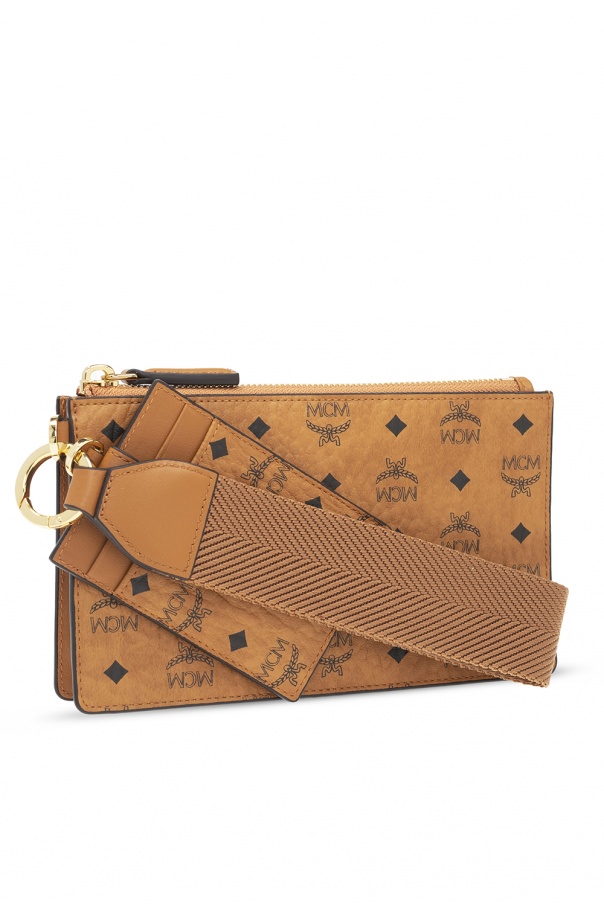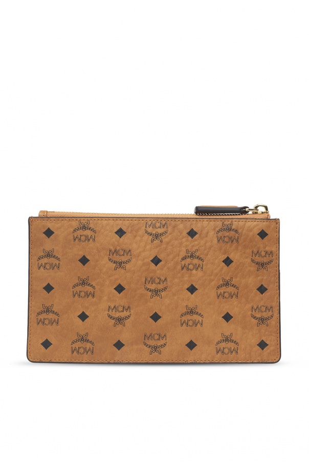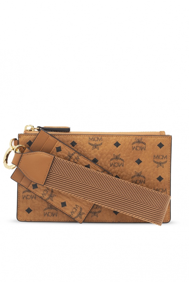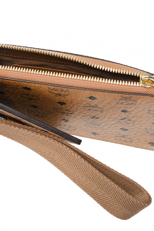 Brown hand bag from MCM. Fastened with a zip, this item is crafted from canvas with a black logo pattern and is complete with gold-tone metal hardware and one internal compartment with one card slot. It comes with a wrist strap and a card holder.