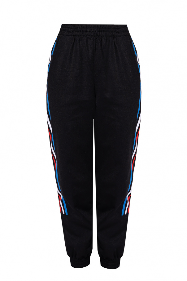 Black track pants from ADIDAS Originals, the ‘Primeblue’ line. Made with recycled materials, this pair features a drawstring waist, two side seam pockets, one back welt pocket, ribbed cuffs, an embroidered logo and the signature three stripes in red, white and blue on the sides. Primeblue is a performance fabric made with Parley Ocean Plastic, which is created from recycled plastic waste intercepted from beaches and coastal communities before it reaches the oceans. Products made of Primeblue contain a minimum of 40% recycled material in total.
