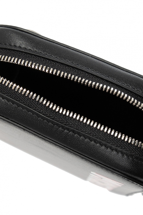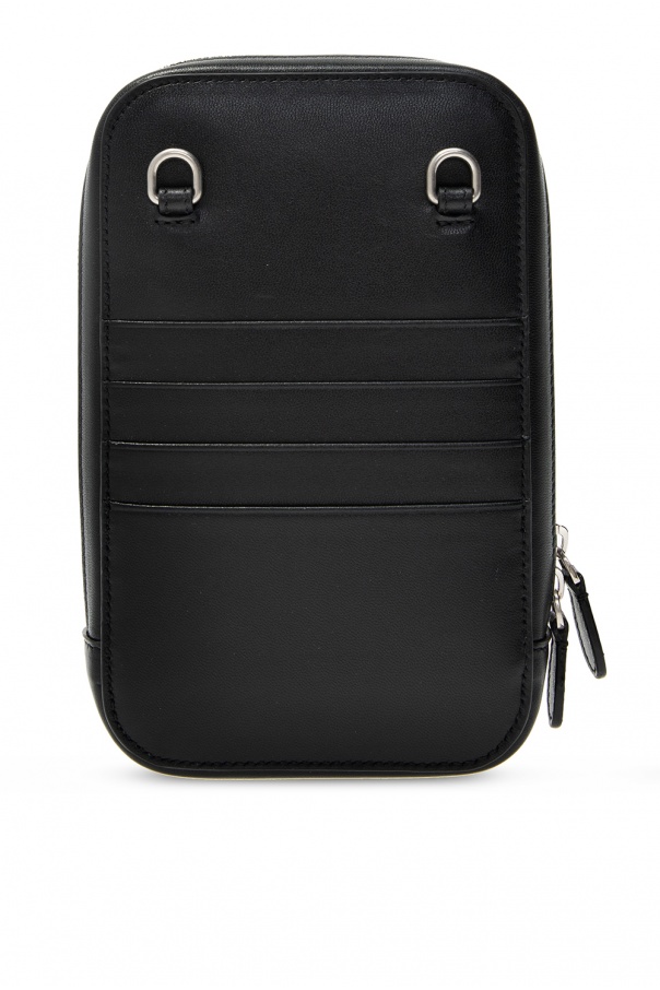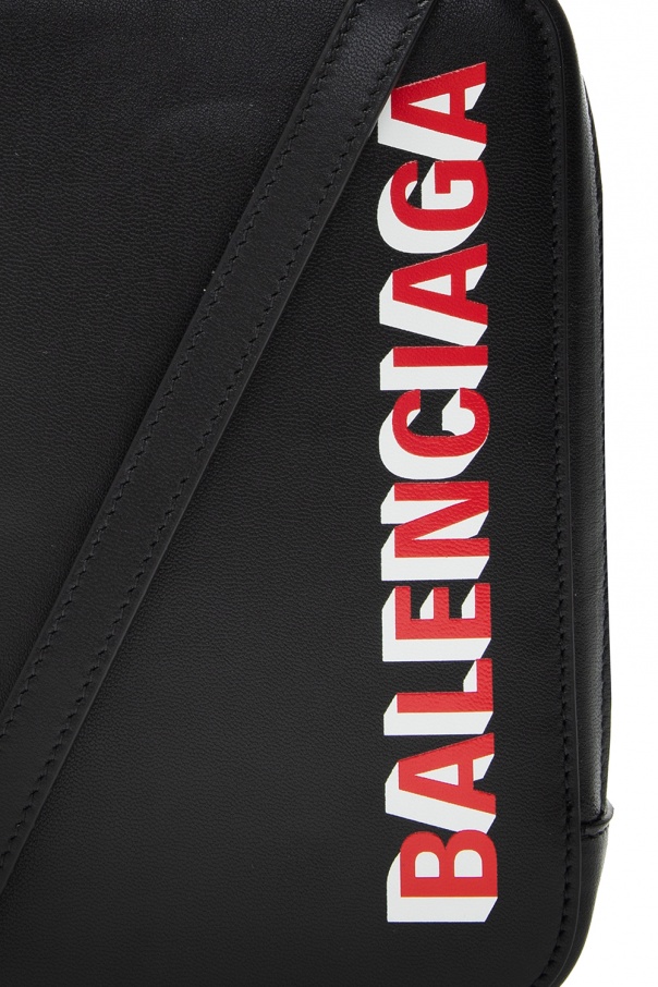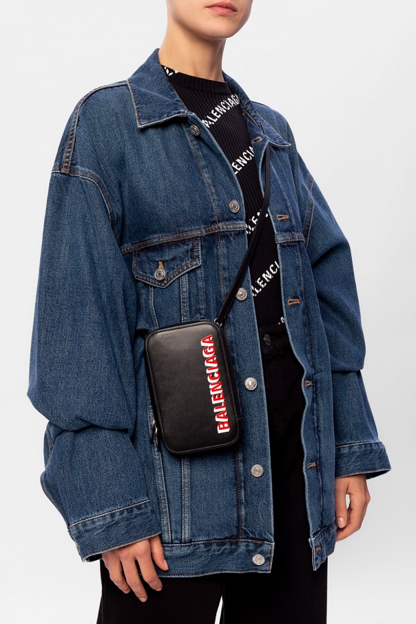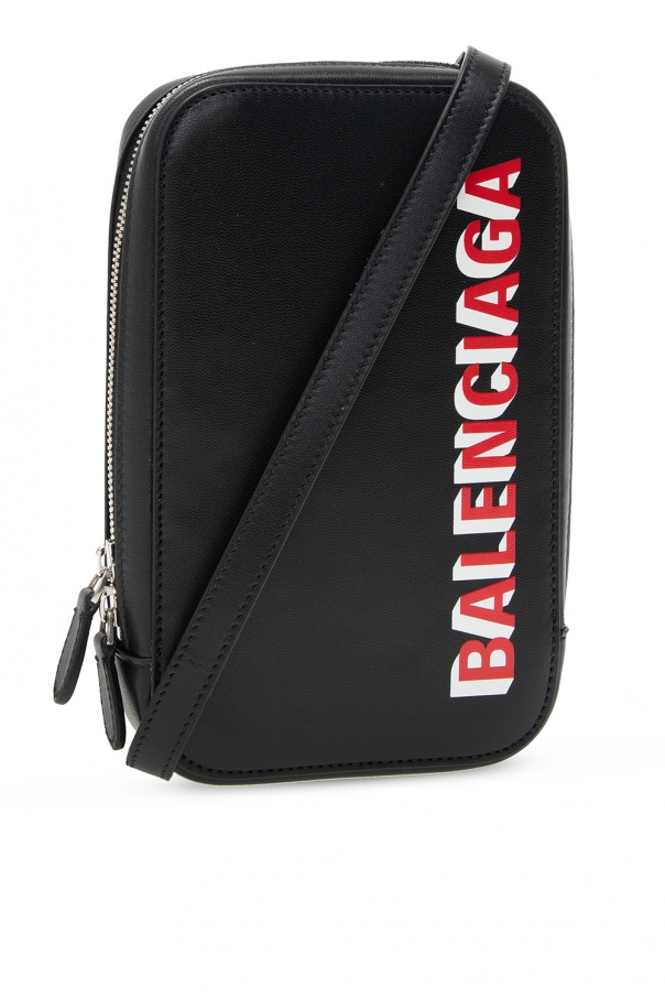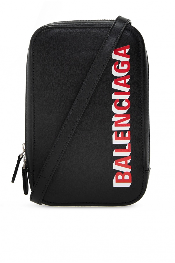 Black phone holder from Balenciaga. Illustrated with a white and red print with the label's logo, this calf leather-crafted accessory fastens via zipper and employs four slip pockets on the back, a detachable neck strap, silver-tone metal fittings and main internal compartment.