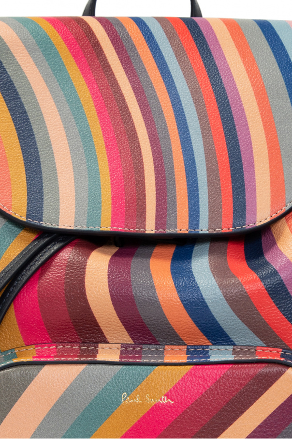 Multicolored backpack from Paul Smith. Crafted from calf leather, this model fastens with a magnetic snap and is decorated with a stripe pattern and an embossed logo. It is complete with a front zip pocket, half-round handle, adjustable shoulder straps, gold-tone metal hardware and one internal compartment with drawstrings and a slip pocket.