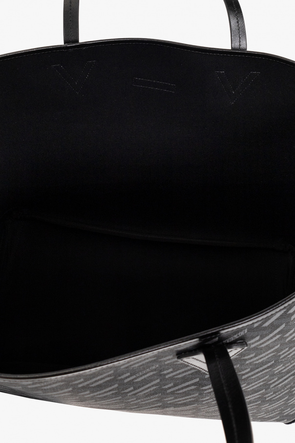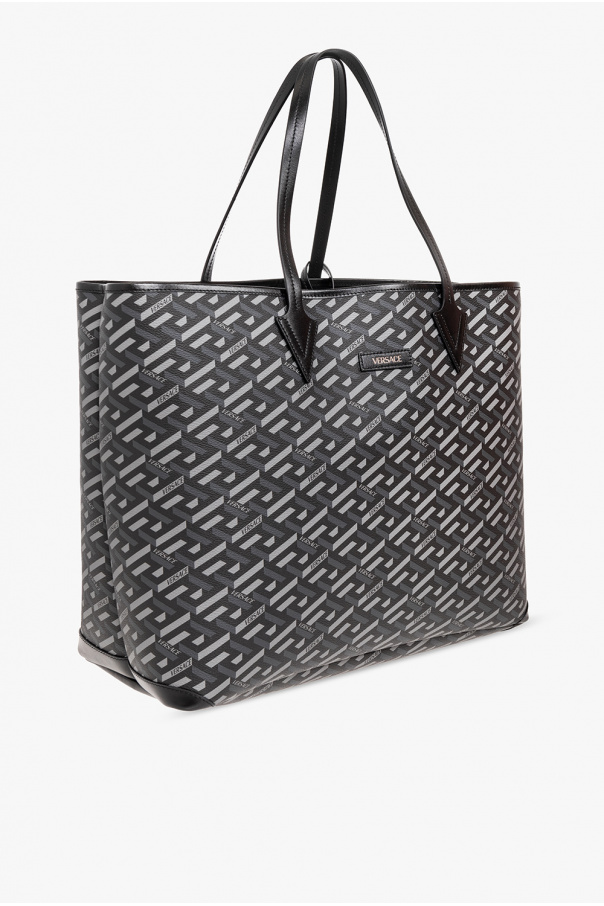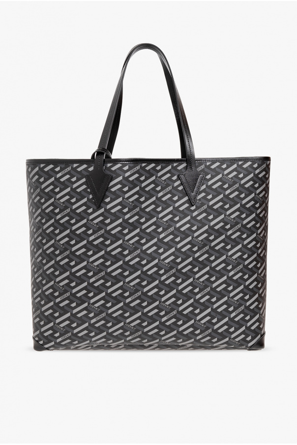Black shopper bag from Versace. Crafted from canvas printed with a grey La Greca pattern, this design features calf leather trims, two half-round straps and one internal compartment with a removable pouch with a snap closure.