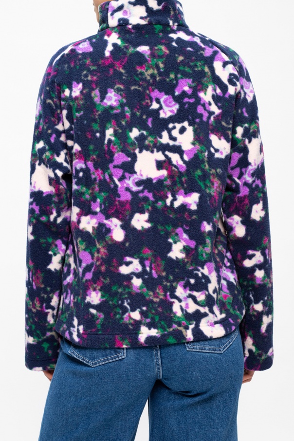 Navy blue and purple fleece sweatshirt from ADIDAS Originals. Illustrated with an all-over pattern print, this style fastens via a zip and features a contrasting chest pocket accentuated with a trefoil logo patch and two side zipped pockets.