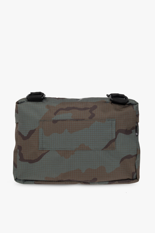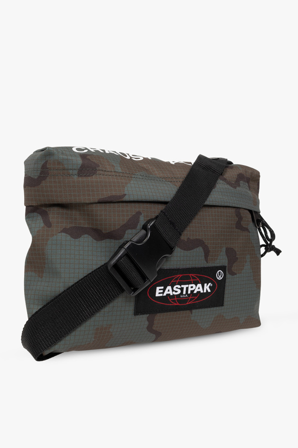Green and brown shoulder bag from Undercover x Eastpak. Crafted from recycled materials and embellished with a camo motif, this design secures with a two-way zipper and features a logo patch, a white graphic print, a zip front pocket, black metal hardware and one internal compartment with a zip pocket.