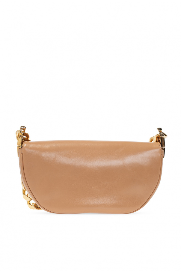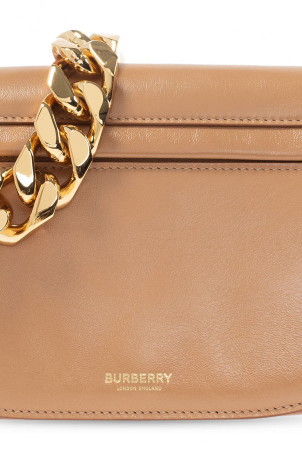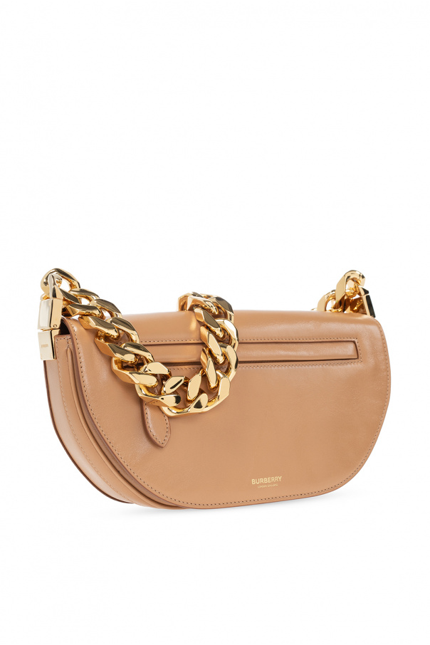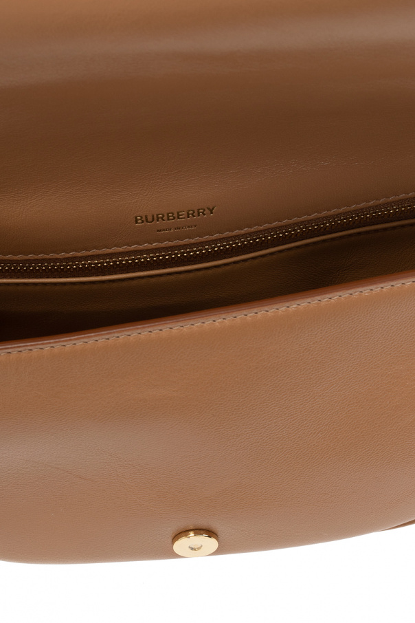 Brown ‘Olympia’ hand bag from Burberry. Crafted from lamb leather, this design features a snap fastening, embossed logo in gold-tone, front zip pocket, gold-tone chain and one internal compartment with one zip pocket.