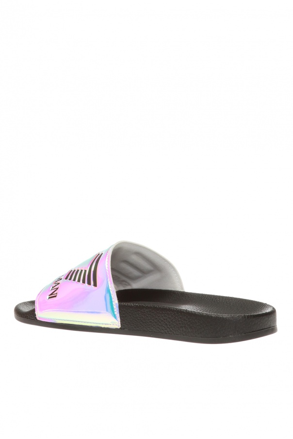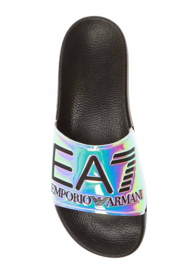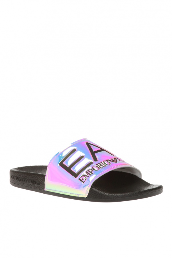 Multicoloured iridescent slides from EA7 Emporio Armani. Embellished with an embossed black logo. Seated on a black rubber sole.