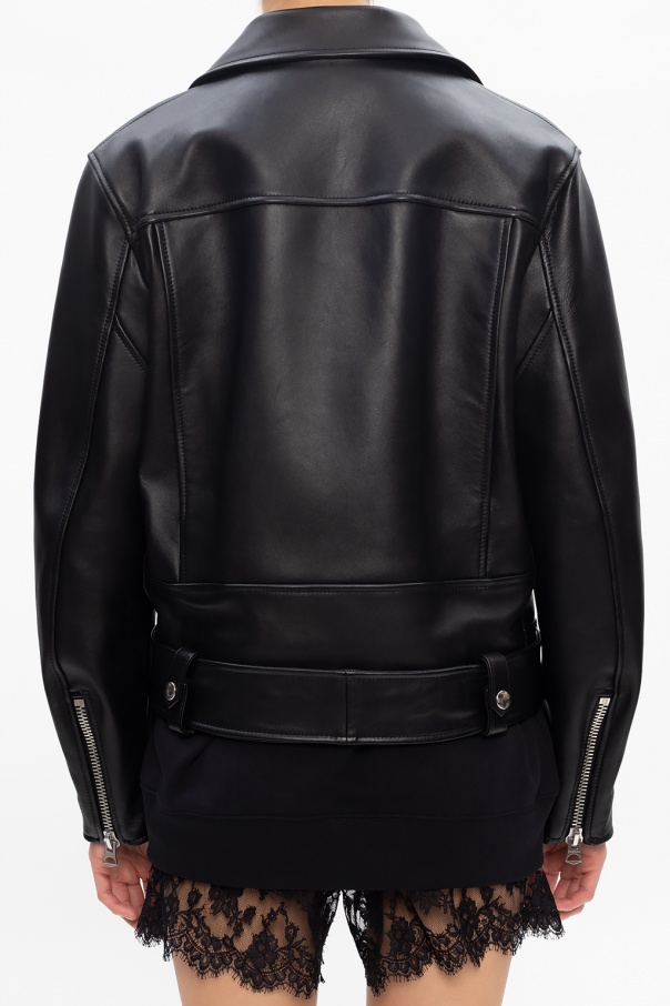Black biker jacket with notch lapels from Acne Studios. Crafted from lamb leather, this long sleeve design features a zip fastening, a zip pocket, a snap pocket and zippered cuffs.