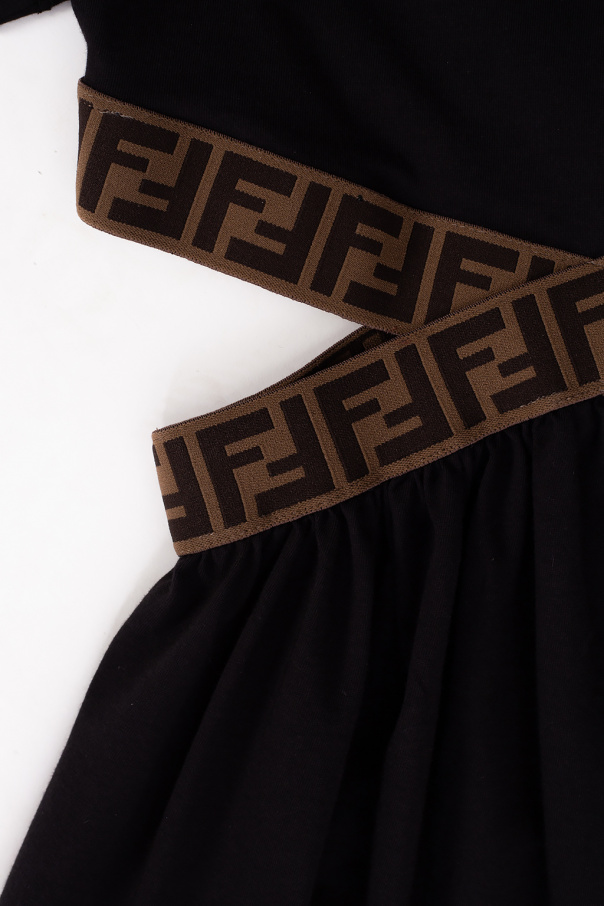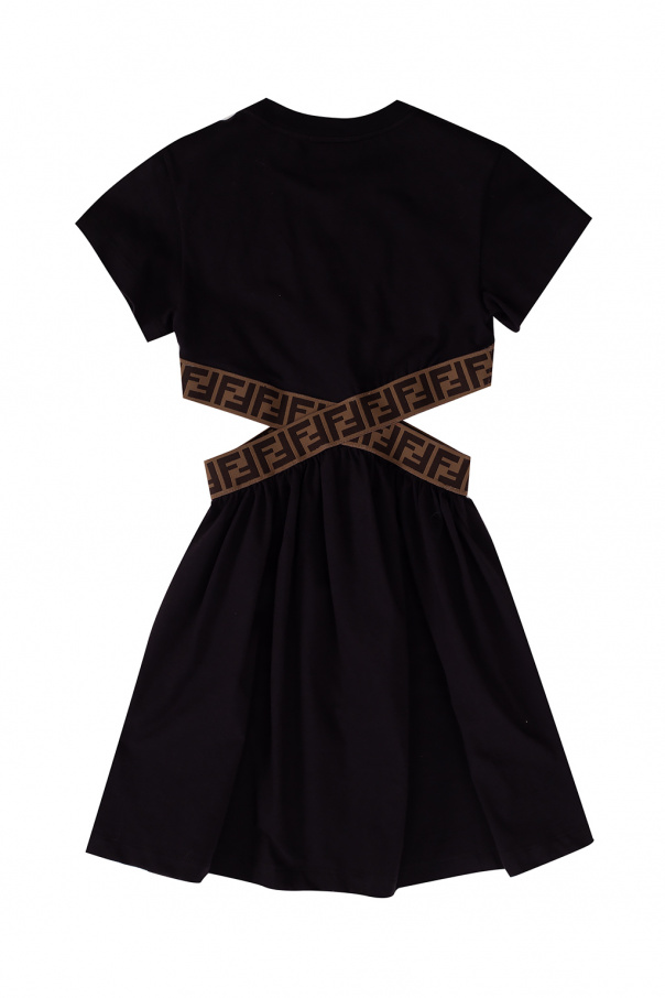 Black dress with decorative cut-outs from Fendi. Made of cotton, this short-sleeved design features a round neck as well as a beige and brown elastic tape with a logo embroidery.