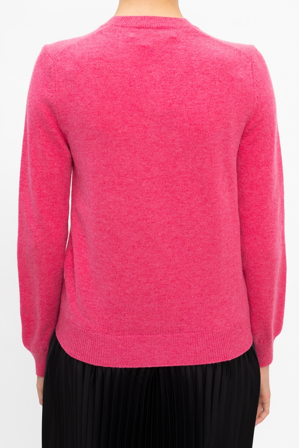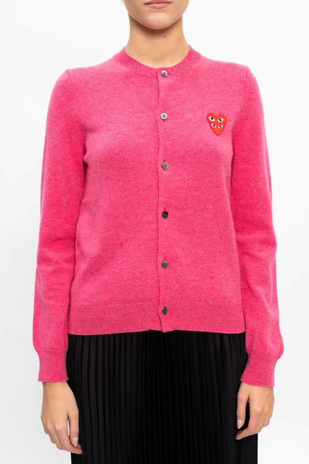 Pink sweater from Comme des Garçons Play. Crafted from wool, this round neck design features button fastenings, red, black and white logo patch and ribbed trims at the neckline, hem and cuffs.