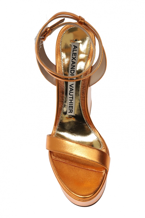 Orange metallic ‘Aoki’ wedge sandals from Alexandre Vauthier. Crafted from leather, this design features a buckled ankle strap and beige leather sole.