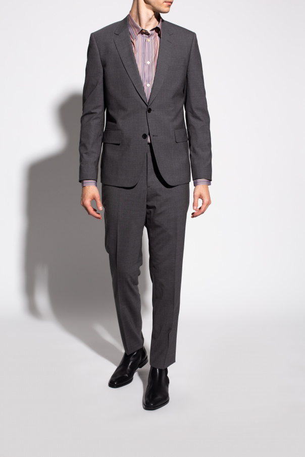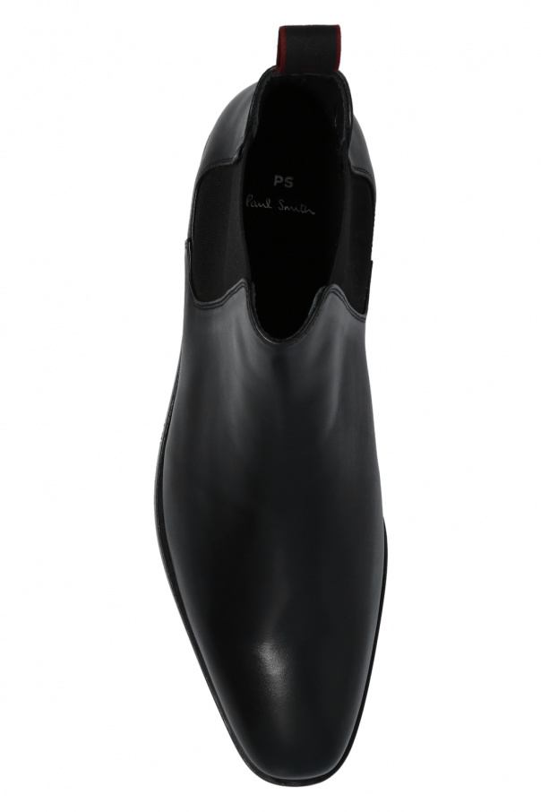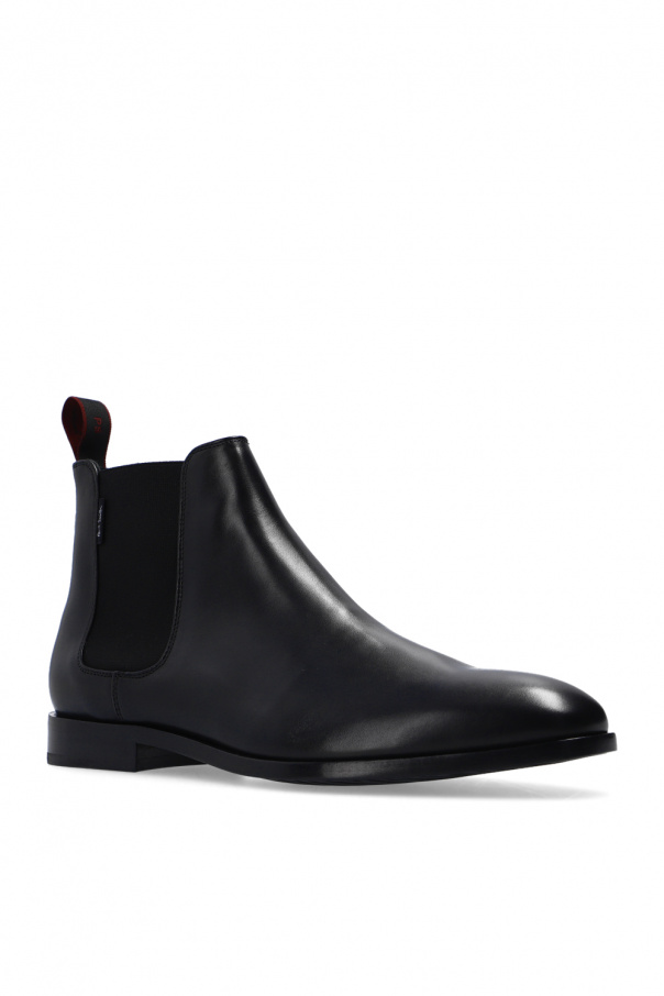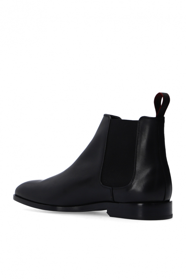 Black ‘Gerald’ ankle boots from Paul Smith. Crafted from leather, this slip-on pair is complete with elastic side panels, a white logo detail and a black rubber sole.