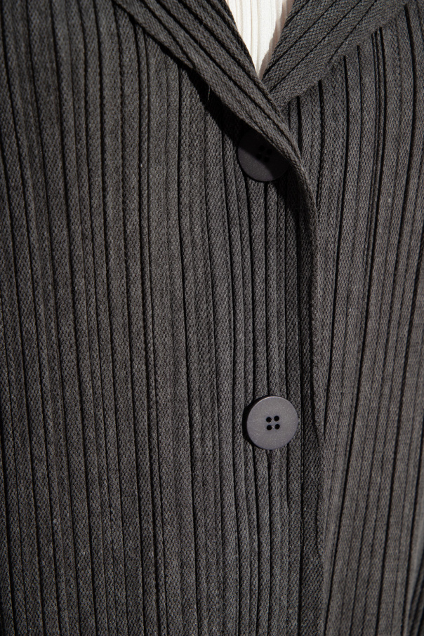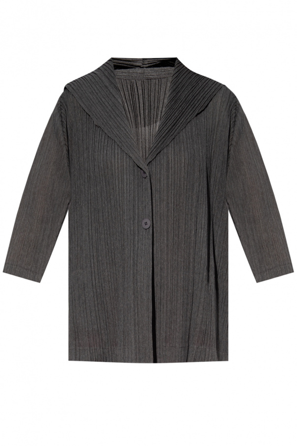 Grey pleated hoodie from Issey Miyake Pleats Please. Fastened with buttons, this long sleeve design is complete with two slip pockets.