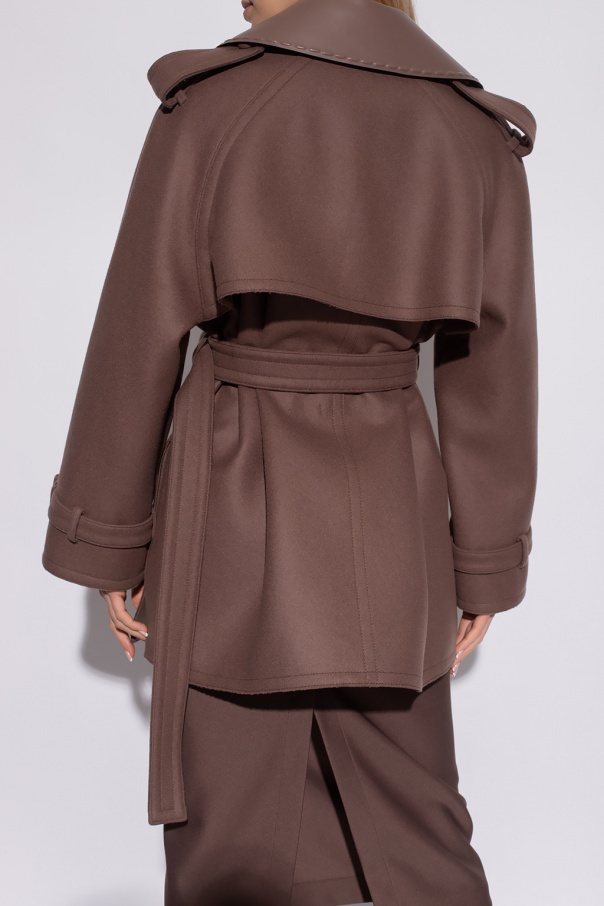 Brown coat from Fendi. Crafted from wool with a double-breasted, cropped silhouette, this style features button fastenings, notch lapels, a buckle belt at the waist, long sleeves and side slits on the bottom hem.