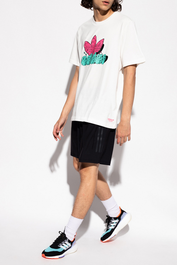 White crewneck T-shirt from ADIDAS Originals, the ‘Better Cotton Initiative’ line. Made of cotton produced in sustainable farms, this design is decorated with a logo print in pink and green.