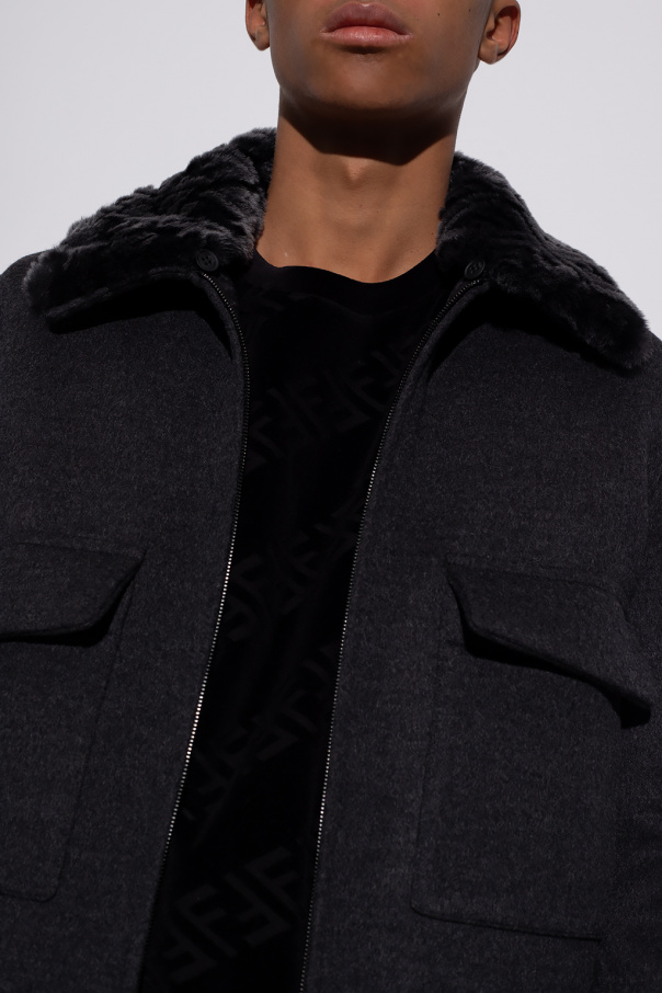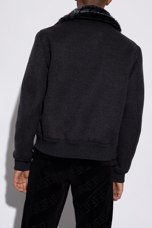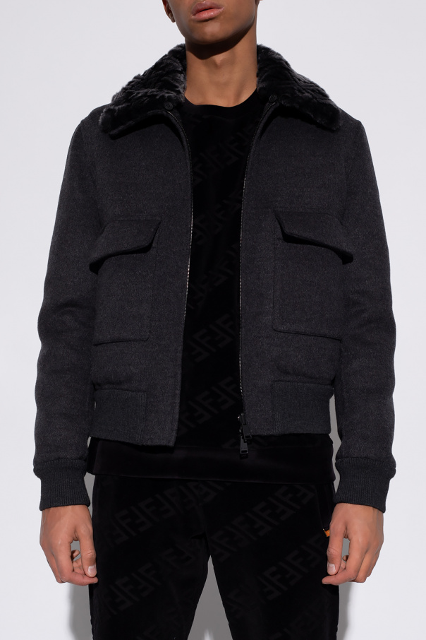 Grey jacket from Fendi. Crafted from wool, this style fastens via a two-way zipper and showcases a detachable fur collar and rib detailing on the bottom hem and cuffs. It reverses between a side with two slip pockets and two snap-fastened pockets and a side featuring two slip pockets and a logo pattern.