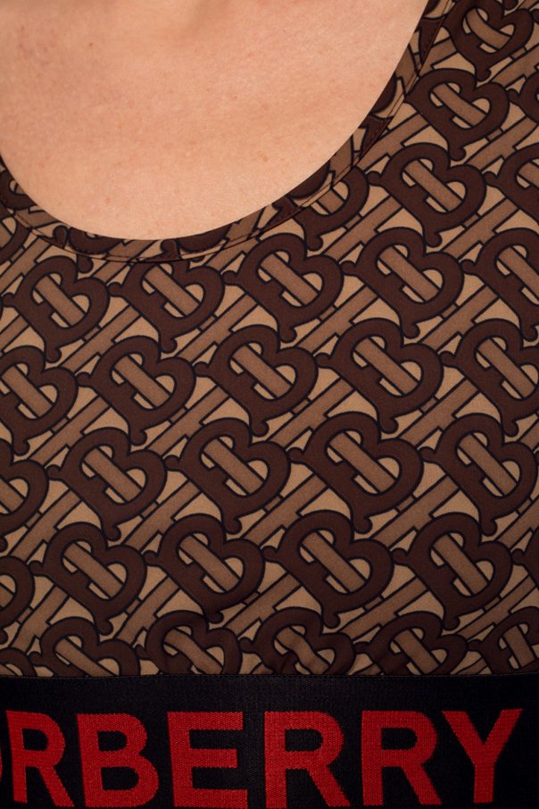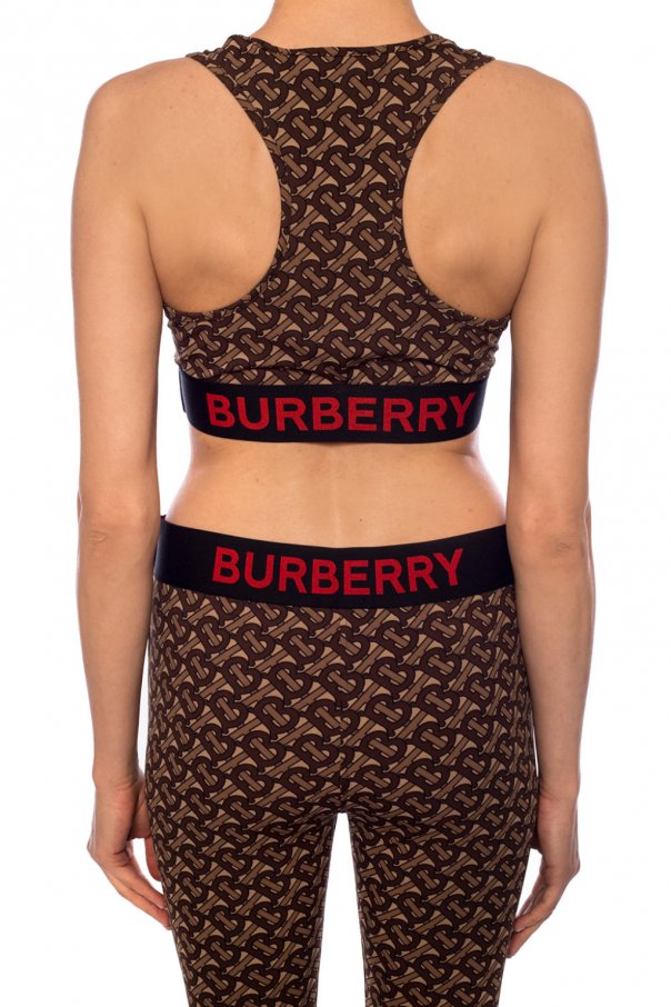 Brown, beige and black jersey top from Burberry embellished with monogram pattern throughout. Features black elastic band with embroidered red logo at the bottom hem.