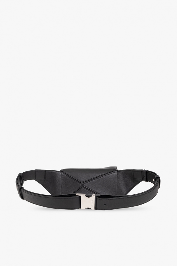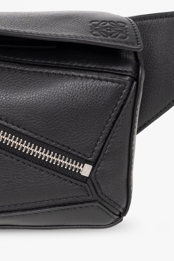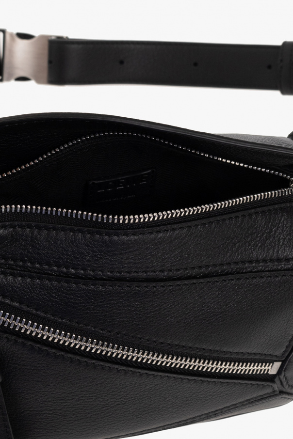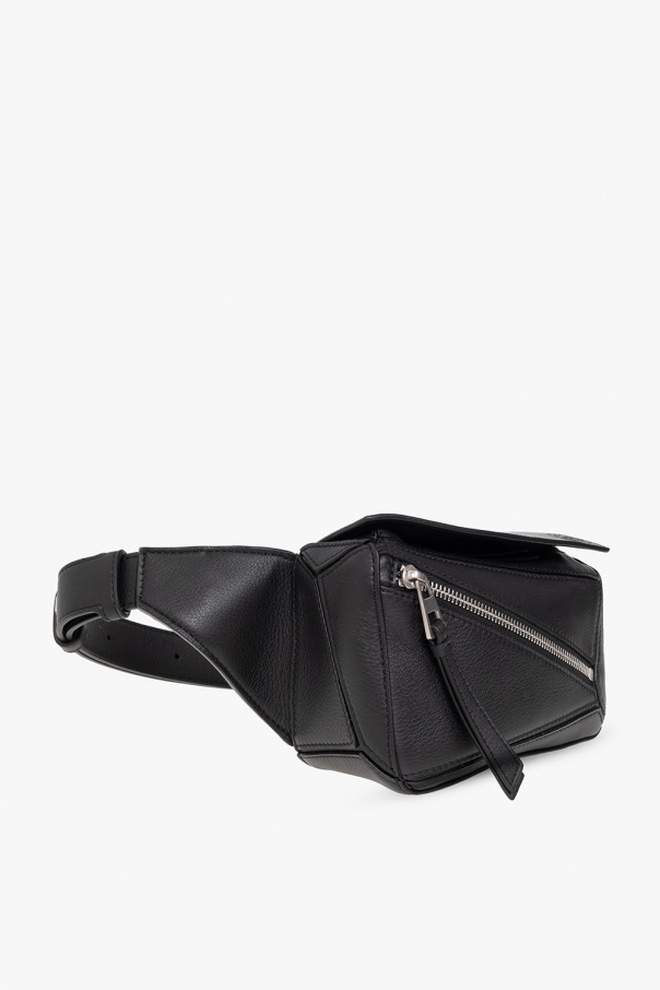 Black ‘Puzzle Mini’ belt bag from Loewe. Crafted from calf leather, this design secures with a zipper and features an embossed logo on the flap, asymmetrical patches, a zip pocket on the front, an adjustable strap with a metal buckle, silver-tone metal hardware and one internal compartment.