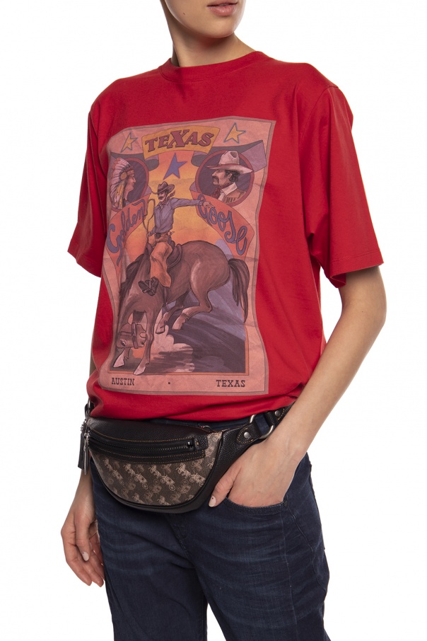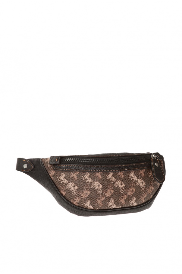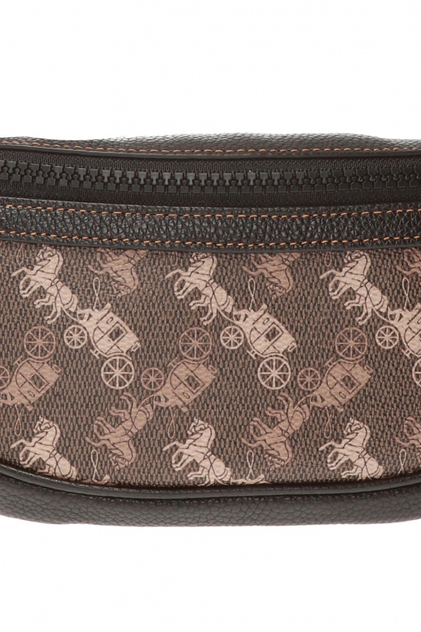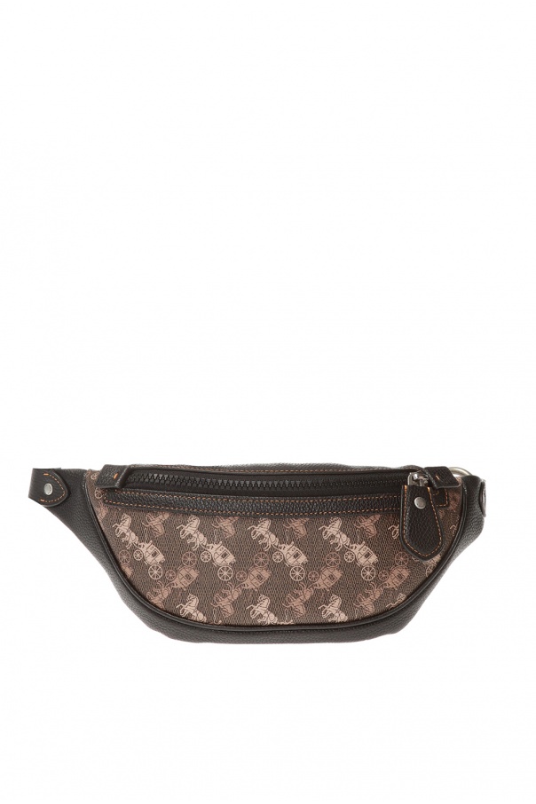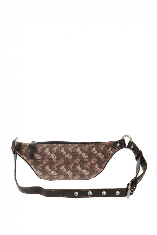 Black and brown ‘Rivington’ belt bag from Coach. Made of canvas. Fastened via zip. Finished with textured leather. Embellished with printed brand's iconic motif from 1950. Features zip pocket on the rear, an adjustable strap and interior with 1 compartment inside.