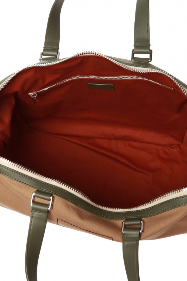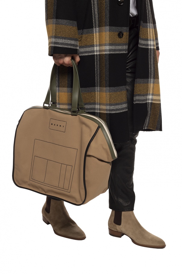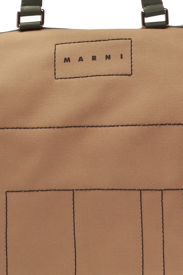 Beige hand bag from Marni. Fastened via two-way zip. Finished with leather. Embellished with an embroidery and logo print in black. Features 2 half-round handles and interior with 1 compartment, 5 slip pockets, 1 zip pocket and orange-red-beige lining.
