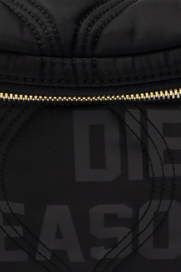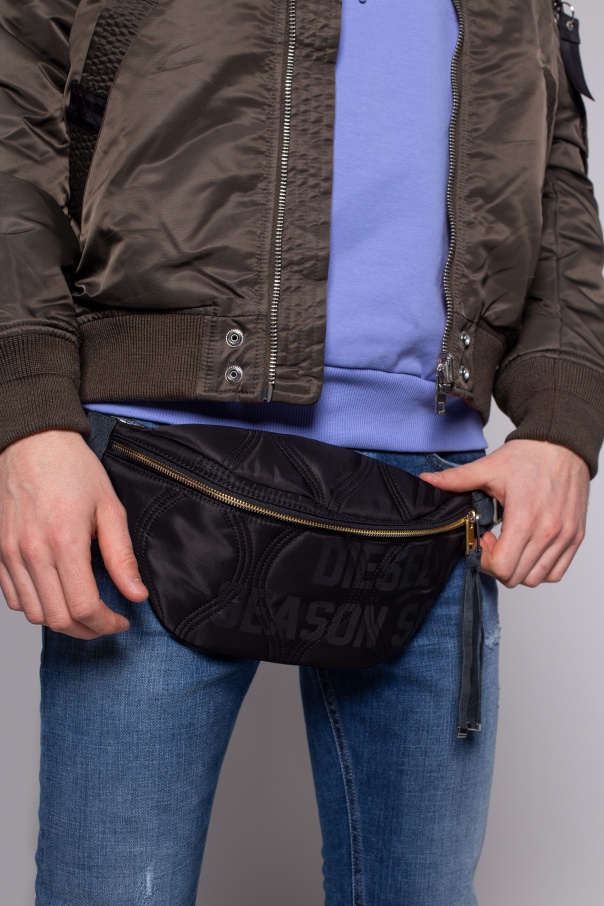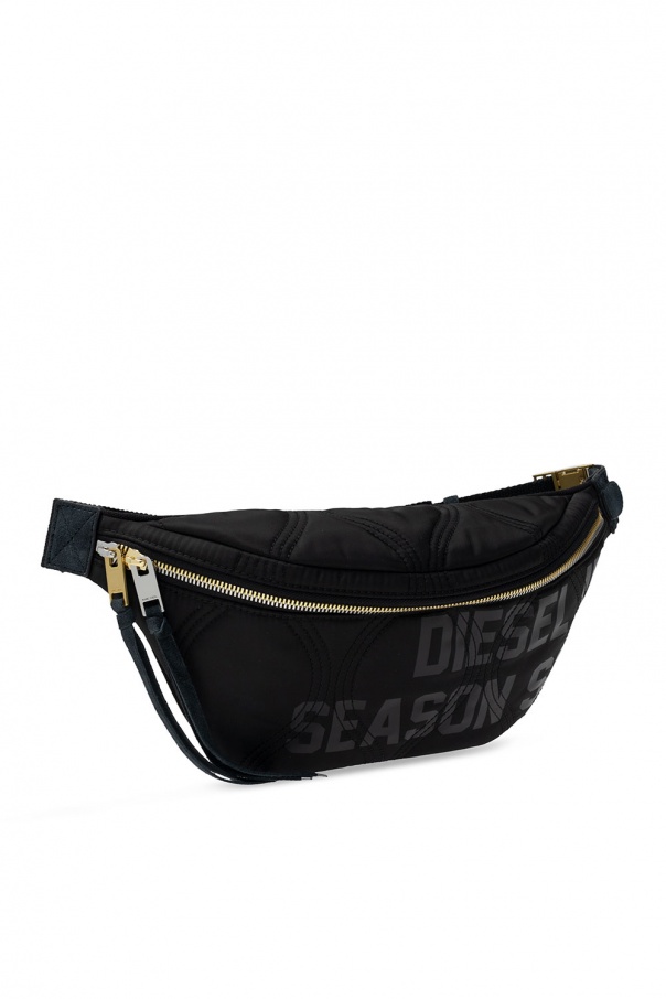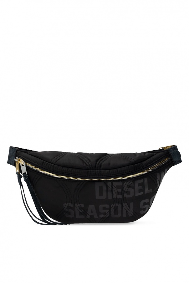 Black belt bag from Diesel. Fastened with a two-way zip, this item is enriched by stitching details and a logo print. It is complete with a back zip pocket, adjustable belt, gold-tone metal hardware and one internal compartment with one slip pocket and one zip pocket.