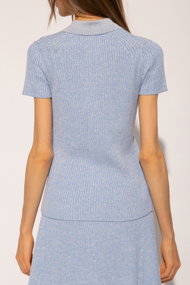 Blue and cream ‘Bonnie’ polo shirt from Samsoe Samsoe. Crafted from a ribbed blend including organic cotton, this style features a button placket and short sleeves.